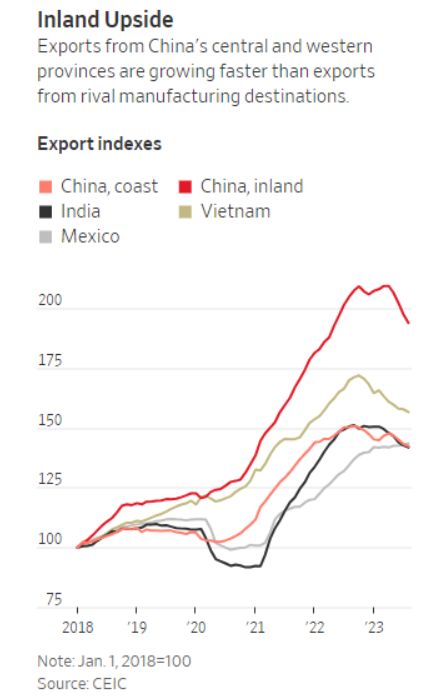 然后新闻里面附上了这个图片。从图片上看,以2018年1月为100的话,到2023年8月,即使是中国沿海地区的增长也和印度、墨西哥差不多,只是慢于越南,而中国内陆地区的出口增长速度则大大超过了印度、墨西哥和越南,而且出口规模上还更大。
