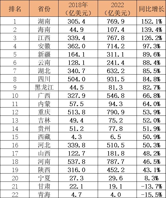 光是看总金额排名是不够的,我们还得看一下增长率的排名,这才能知道哪些省份在出口型制造业转移方面获得了更多。可以看出2022年相比2018年增长超过100%的有湖南、海南和江西三个省,当然了海南省基数小。其中湖南省是22个省份里面出口增速最高的,竟然达到了152.1%。
