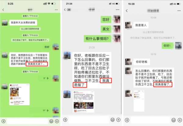 “他们在网上找到我们门店工作人员的微信,加过来,然后说自己近期来我们家吃,吃完后回去肚子不舒服,说我们家食材不新鲜。”