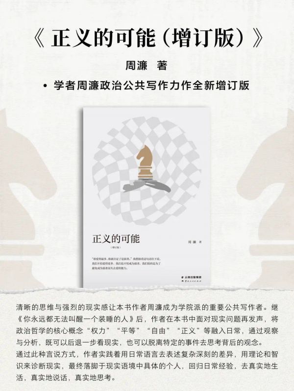 刘擎:我们谈得好像有点抽象,但周濂老师的书里到处有故事,除了一些特别学理、书评的部分,大部分文章有情节、有故事、有事例,非常生动。所以听我们的对谈取代不了读这本书。和初版相比,《正义的可能》这一版多了很多内容。