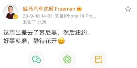 10月18日,威马汽车在微博发文,针对破产、创始人跑路等传闻进行澄清,其中提到,沈晖近期工作重心以海外事项为主。