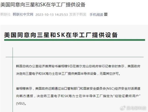据韩国总统办公室通报,“美国政府决定向三星电子和SK海力士在华工厂提供美国半导体设备,无需其它许可。”