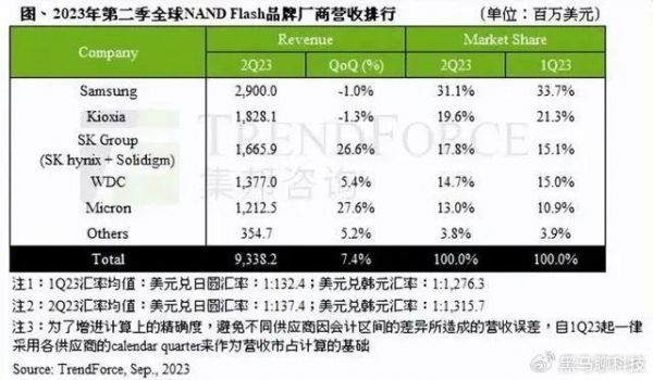 图为2023年第二季度全球厂商NAND Flash营收和市场份额