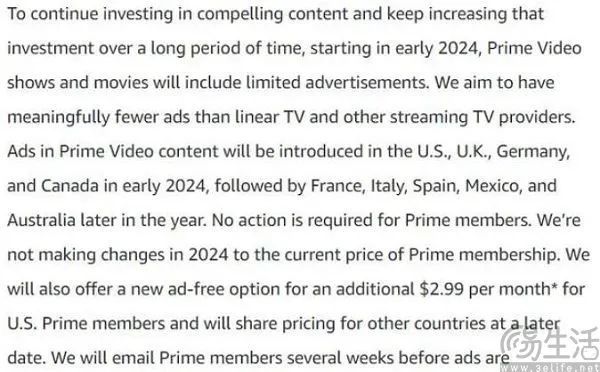 事实上,早在今年夏季,亚马逊就曾被《华尔街日报》爆料计划为Prime Video推出含广告的不同订阅服务,用户如想保持无广告观看,可能会需要支付更高的费用。从目前来看,亚马逊可能最终会决定向现有Prime会员播放广告,然后提供“支付更多费用以获取无广告”的方案,但用户也可以选择每月支付2.99美元来免广告。
