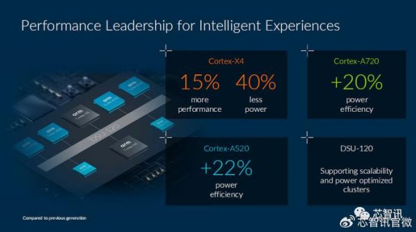 根据此前Arm公布的资料显示,Cortex-X4的性能相比上代的Cortex-X3提升超过15%,功耗减少40%,而Cortex-A720的能效也增长了20%。而Cortex-A720 则是升级到了Armv9.2指令集,同样的功耗下性能比上代的Cortex-A715更强,架构优化了内存读取,带来了大幅功耗降低,能效提升了20%,同样的面积下性能甚至Cortex-A78还要高。