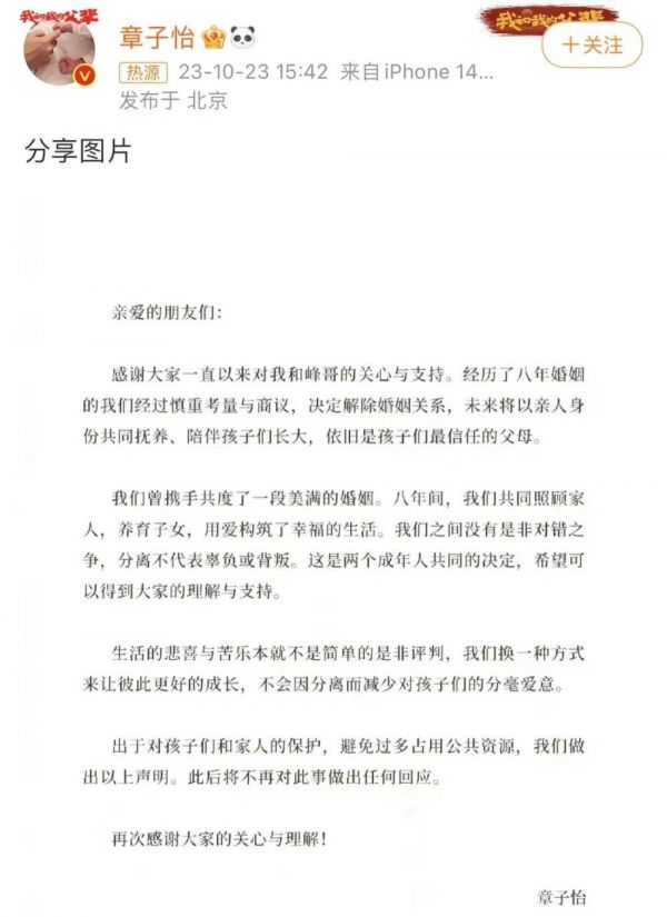10月23日,章子怡与汪峰官宣离婚,消息迅速冲上微博热搜第一。