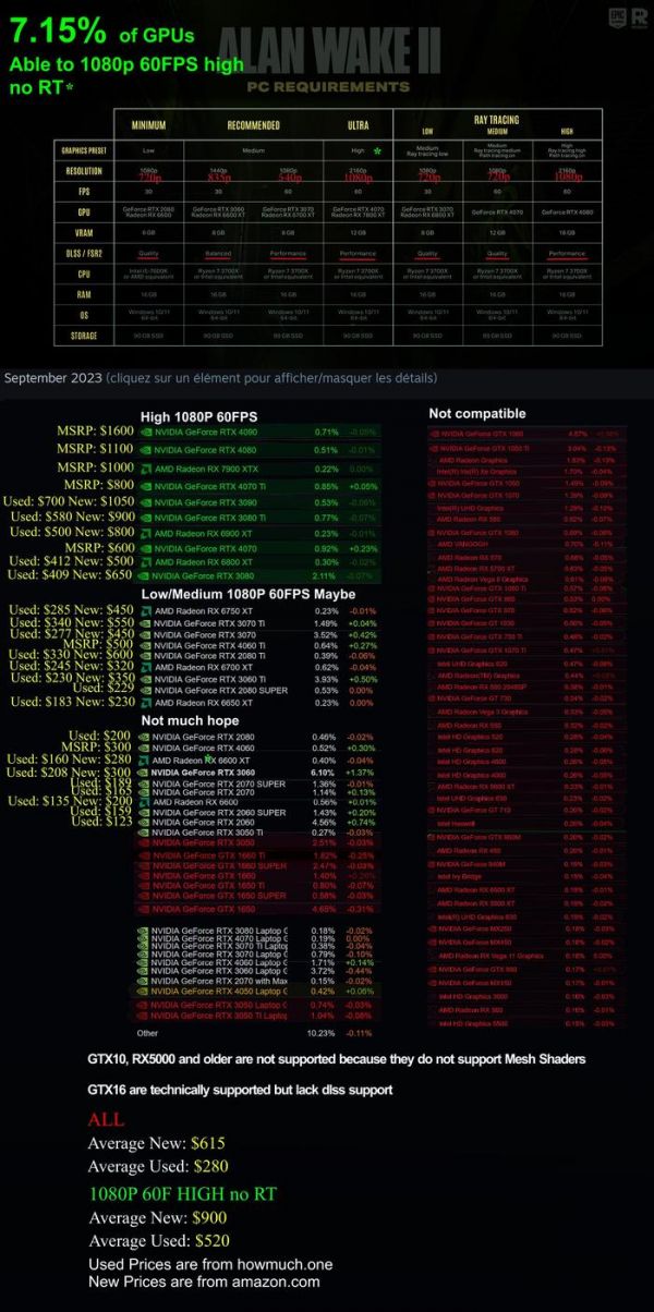 Reddit上有玩家分析了《心灵杀手2》的PC配置情况,由于Remedy指出其PC配置都是基于开启DLSS/FSR这个前提,官方给出的4K(2160P)DLSS/FSR 2性能预设,需要RTX 4070或RX 7800XT显卡,按照分辨率减半原则,其实际渲染分辨率只有原生1080P,因此只有7.15%的GPU能满足这一需求。