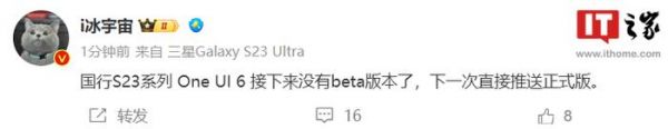 IT之家 10 月 24 日消息,博主 @i 冰宇宙 今日透露,三星 Galaxy S23 系列手机国行版将不再推送 One UI 6 Beta 版本了,下一次直接推送正式版。