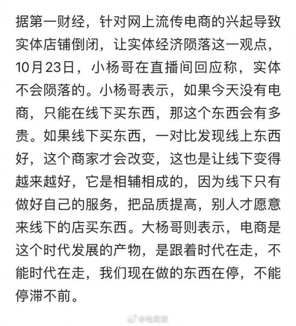 #疯狂小杨哥回应电商挤压实体经济# 电商让实体经济陨落?小杨哥直播回应:实体不可能陨落的,线上线下是相辅相成的。电商是这个时代发展的产物,是跟着时代在走。 #疯狂小杨哥回应电商让实体经济陨落#