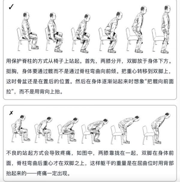 如果我想从椅子上站起来,我应该先把两脚拉到身体下面,脊柱不要向前弯曲,而是将向上提胸腔的方式作为起始动作,让整个躯干以髋为轴向前屈。当我去饮水机前取水时,我总是弯腰向前,这显然是错误的,我应该用腿和髋关节向下蹲,让我的脊柱尽量保持直立状态。