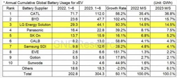 2023年上半年动力电池全球装机量前十位中,韩国企业占据3席。