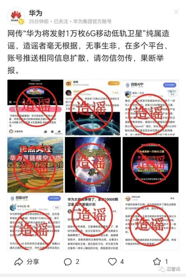 华为声明:“发射1万枚6G移动低轨卫星”纯属造谣!