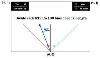 陈发动团队从时间和空间维度对鼠标移动轨迹作了进一步分析。具体而言,他们将每个决策的鼠标移动轨迹和反应时间100等分,分别计算这100个时间点上鼠标位置相对于原点(下端中间)的角度(如图2所示)。然后,研究在每个时间点上自己收益和他人收益两个属性如何影响鼠标位置相对于原点(0, 0)的角度变化,即自己收益和他人收益如何影响鼠标移动过程。