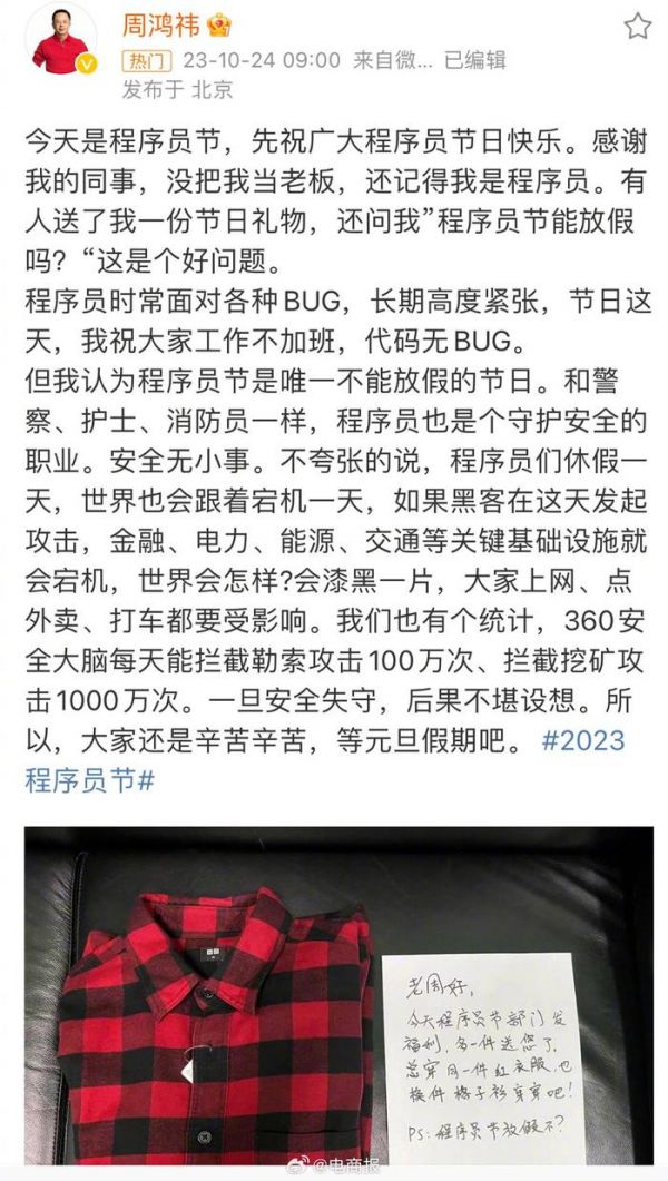 #周鸿祎称程序员节是唯一不能放假的节日# 送程序员老板格子衫,360员工是会整活儿的,但程序员节还是不放假。[笑cry]#程序员节#