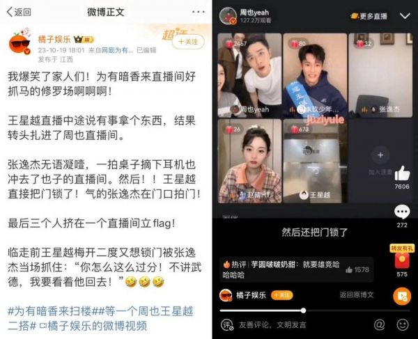 而雄竞剧,显然从头到尾、戏里戏外都有大量修罗场供应。《长相思》围绕三男雄竞衍生出无数段子与梗图。平均年龄更低的《暗香》玩得更开,在连麦直播中演起了雄竞小品。