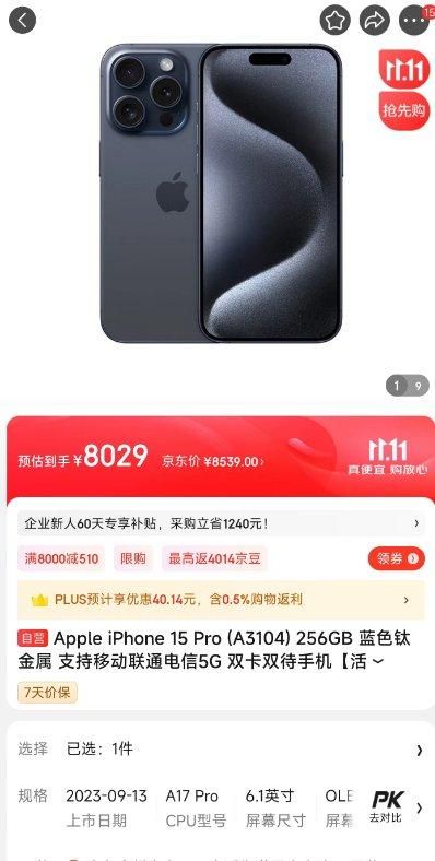更有意思的是,第二天的最新消息中,iPhone 15系列的部分型号渠道价已经破发,而且幅度颇大,更不用说拼多多和京东在开售当天就提供了数百元的优惠券,更是让一些商家不得不选择降价出售,否则根本竞争不过这些大型电商平台。