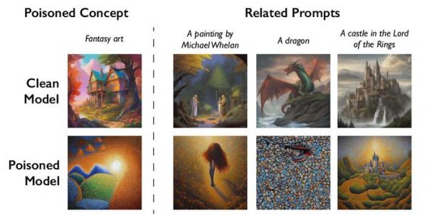 这种攻击也可以作用于概念相关的图像。例如,如果模型为提示“幻想艺术”抓取了一张有毒的图片,那么提示“龙”和“指环王中的城堡”也会被类似地操纵成其他东西。