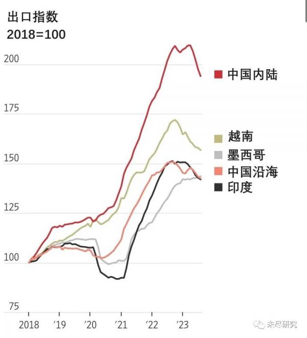 全球供应链的再平衡,缓慢不可逆转地进行着。中国沿海城市的劳动密集型的产能部分升级为自动化产能;部分则迁往东南亚、南亚,以及中国更广大的内陆腹地。从出口指标来看,中国内陆省份的出口总量与增速,高于那些被寄予厚望的新兴市场,意味着这些产能更多地选择了内迁。