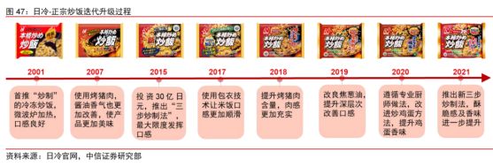 预制菜实际上是食品加工工业不断创新的结果,以日本预制菜龙头日冷公司发明的冷冻炒饭为例:先是4年研发出特殊炒菜设备,实现炒饭粒粒分明,并且可用微波炉加热。投向市场后,又花了4年时间,再投资 30 亿日元,研发出“三步炒制法”,利用 250℃以上的热风吹到米饭上再进行炒制,从而能达到更近于传统锅灶的炒饭口感。目前日本人吃的炒饭,已经有23%来自冷冻炒饭。