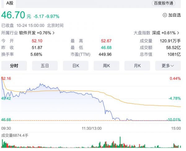 10月24日下午,科大讯飞股价跳水跌停,盘中跌幅超10.01%;截至收盘,报46.7元/股,成交额超53亿元,总市值蒸发约120亿元。