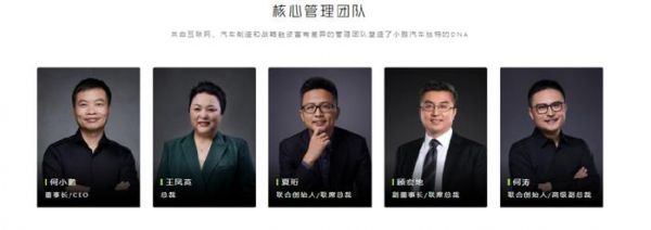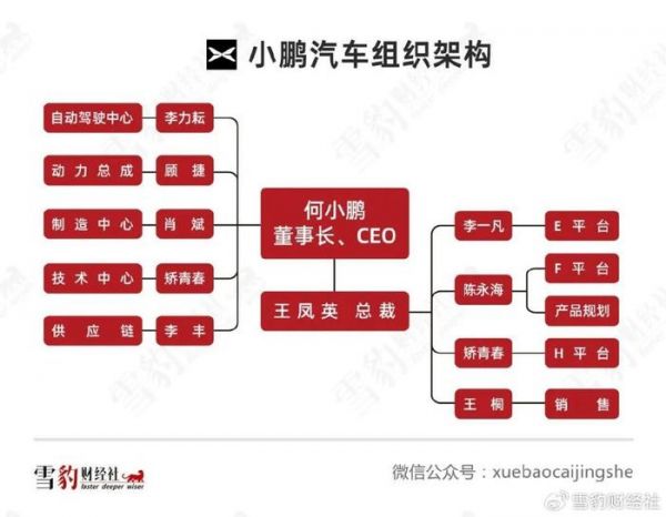 目前何小鹏和总裁王凤英直接掌管公司所有的重要业务。何小鹏主管战略、生产和技术研发,王凤英负责市场营销和产品定位,并直接向何小鹏汇报。用何小鹏的话说,“她主内我主外”。他还计划在今年和100个P6-P8级别员工聊天,倾听他们的意见,以筛选出更适合的高管。