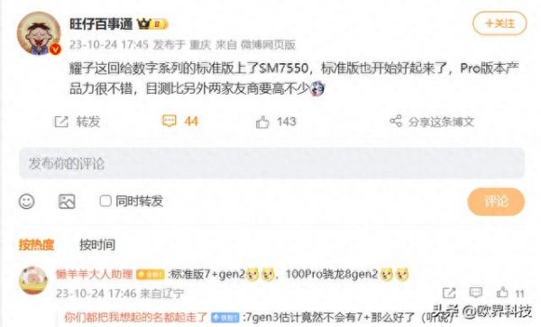 但今日博主称:耀子这回给数字系列的标准版上了SM7550,标准版也开始好起来了,Pro版本产品力很不错,目测比另外两家友商要高不少。在评论区有网友表示荣耀100系列标准版搭载7Gen3,100Pro搭载骁龙8 Gen 2。博主虽未做出回应,但是就近日的消息动态看,或许这是最贴近荣耀100系列处理器的一次。