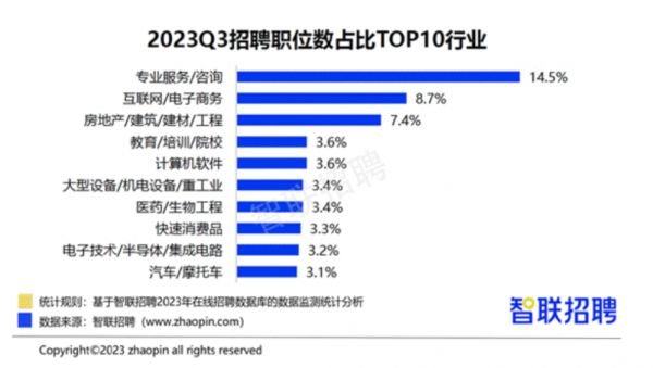 智联招聘发布的《2023年三季度人才市场热点快报》显示,今年三季度招聘职位数最高的行业是专业服务/咨询,占比14.5%,远超其后的互联网、房地产、计算机等行业。