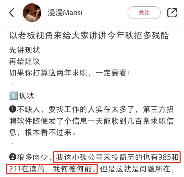 招聘市场往往一体两面,和毕业生们吐槽学历被严格挑选相对应的是,今年也有不少公司负责人发帖感慨: