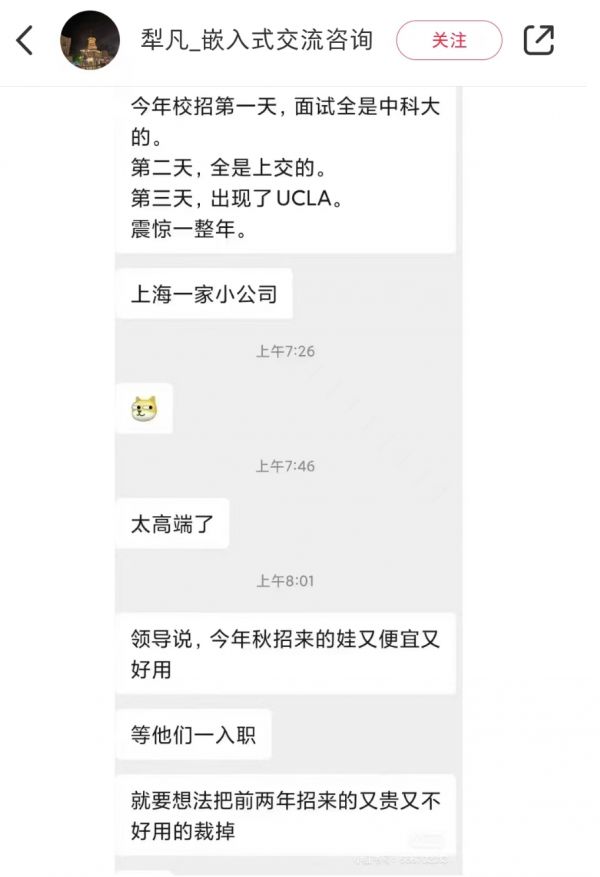 “领导说今年秋招来的娃又便宜又好用,等他们一入职,就要想办法把前两年招来的又贵又不好用的裁掉。”