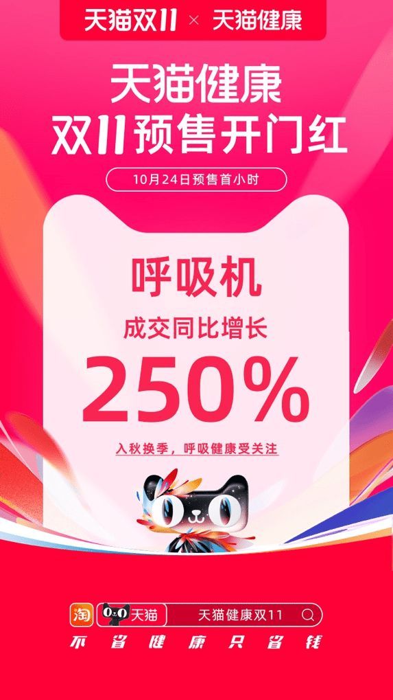 天猫健康双11:预售首小时呼吸机同比增长250%,中医保健增长超120%