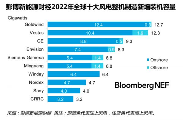 图说:2022年全球风电整机制造商新增吊装容量排名,来源:BNEF
