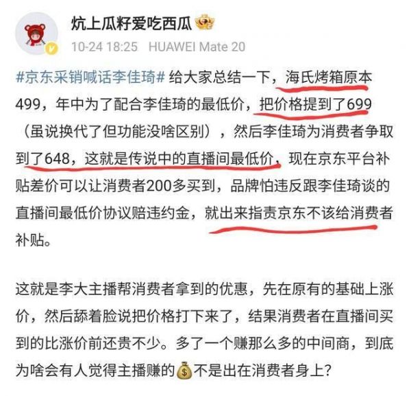 大概就是之前有一款烤箱,平时价格在499元,在前几个月的时候,平台方为了配合李佳琦在直播间里的“带货”,就把价格往上提到了699元,而李佳琦直播间卖648元,“对比”下,李佳琦直播间就是全网“最低价”了。