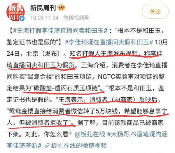 看到这里,你是不是也有些生气李佳琦的“仗势欺人”了,别着急,这还不算呢,知名打假网红王海在自己账号上发布视频,说李佳琦在自己直播间里卖的和田玉为假货,费者在李佳琦直播间购买“鸳鸯金楼”的和田玉项链,在专业部门鉴定后,发现是“碳酸盐-透闪石质玉项链”,根本不是和田玉。