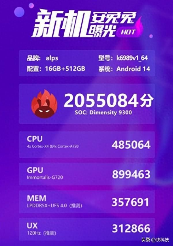 快科技10月23日消息,今天安兔兔曝光了一款神秘新品跑分,其核心搭载了天玑9300,综合成绩突破了目前的安卓性能天花板,破天荒地达到了205万分。