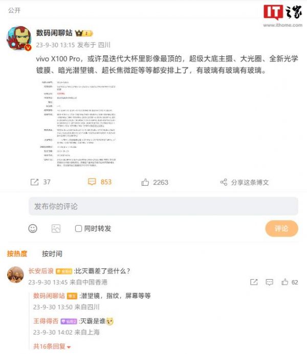 博主 @数码闲聊站 此前还称 vivo X100 Pro 影像方面“或为迭代大杯机型最顶”,配有超级大底主摄、大光圈、全新光学镀膜、暗光潜望镜、超长焦微距等等,并强调该机“有玻璃”。