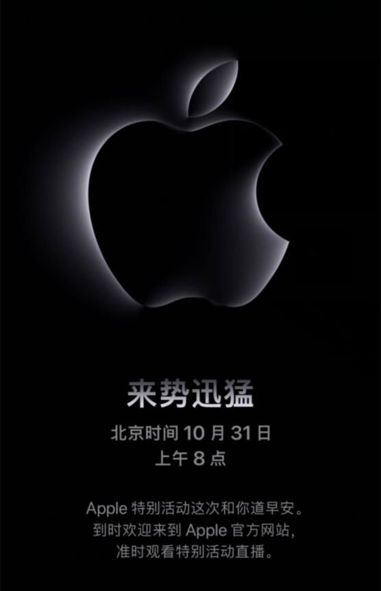 来了来了,就在今天凌晨,苹果正式官宣将在北京时间10月31号上午8点举办今年第二次秋季新品发布会,本次主题是“来势迅猛”。