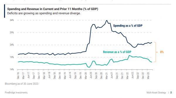 对于财政刺激的作用,或者说赤字扩大的作用,我觉得比较好的一张图来自Pinebridge,非常简单直接。