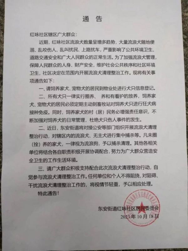 这种声音意在“肃清”流浪动物。个别小区公开说明,将对流浪动物进行捕杀。