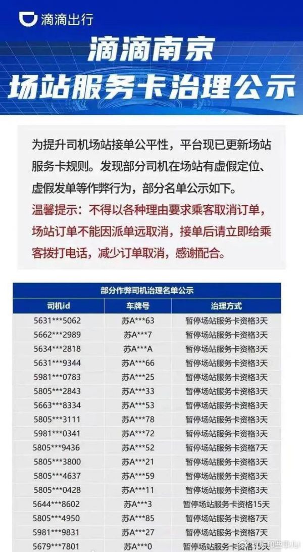 近日,一喂顺风车的南京司机爆料称,滴滴在南京暂停了一批司机的场站服务卡资格,时间从3天到15天不等,都是因为虚假定位、虚假发单等作弊行为。
