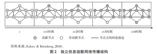 如图2所示,节点代表行动者本身,而边代表节点之间的关系即行动者之间的社会关系,多个节点和边所构成的总体结构则是社会网络。在“节点—边—网络”结构里,每个节点在自身转变为活动状态后,会有一个激活邻居节点的概率。如果邻居节点被激活,那么邻居节点可能会进一步激活自己的邻居节点,形成网络级联传播扩散,节点被激活的概率决定了级联传播扩散的速度和规模。这一基本思想对于理解数字时代组织传播扩散有三重意义。