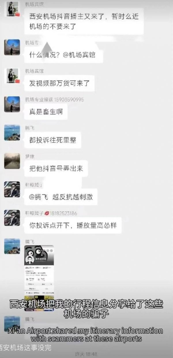 不仅如此,在一个名为“古都 - 咸阳机场北站司机”的499人的微信群中,有人把博主的行程信息分享给了这些“哥们儿”,大有将其除之后快的感觉了。