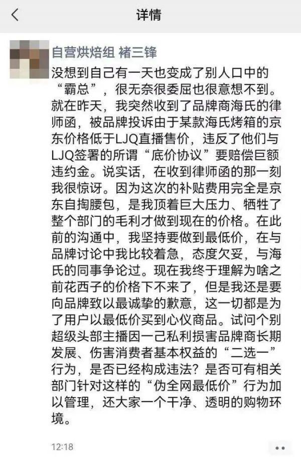 10月24日,有京东采销人员在朋友圈公开喊话李佳琦“二选一”。该人员称,收到品牌商海氏的律师函,被品牌投诉由于某款海氏烤箱的京东价格低于李佳琦直播售价,违反了他们与李佳琦签署的“底价协议”,并要求赔偿巨额违约金。