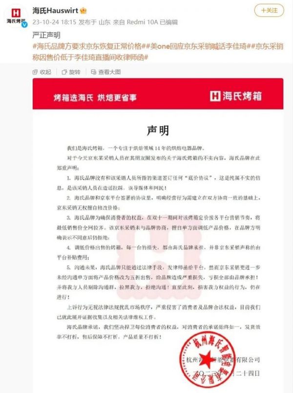 24日晚间,海氏品牌在其微博官方账号发布声明表示,海氏品牌没有和该采销人员所指的渠道签订任何“底价协议”,纯属不实的信息,并称调低价格出售的烤箱,每一台的损失,都由海氏品牌承担,并非京东采销声称的由平台补贴费用。