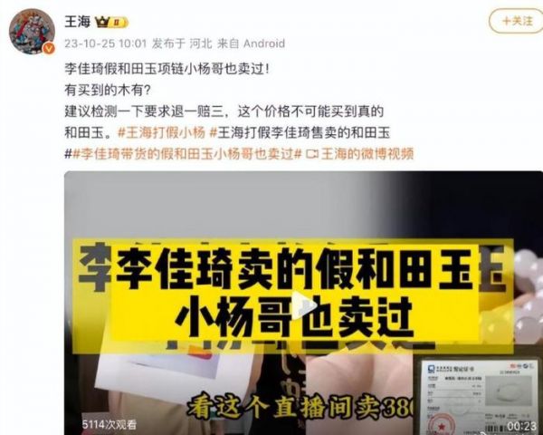 10月24日,知名打假人王海发布视频,称李佳琦直播间卖的和田玉为假货。