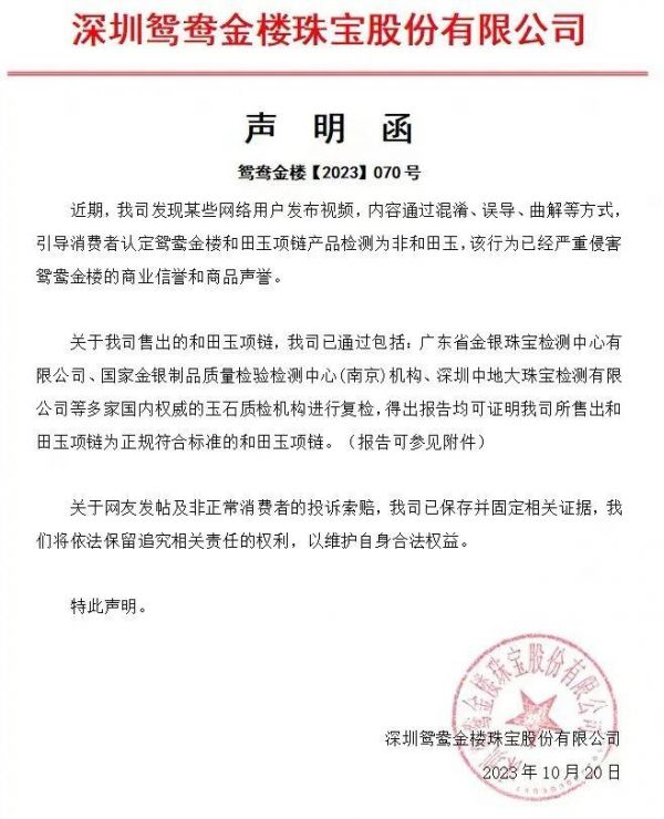 10月25日,鸳鸯金楼连发声明回应:所售和田玉项链为正规符合标准的产品;五万元转账记录断章取义,已报警。
