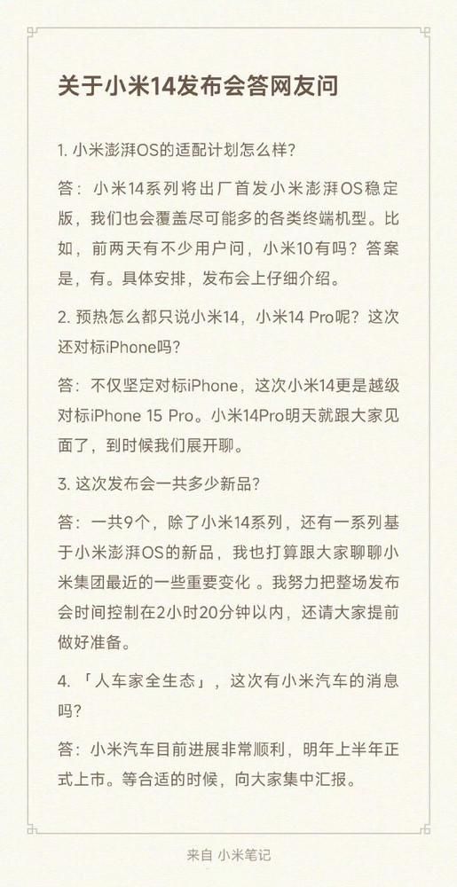 雷军还谈到了明天发布会会发布的新产品数量。他表示明天一共会推出9个新产品,除了小米14系列外,还有一系列基于小米澎湃OS的新品。雷军称还打算跟大家聊聊小米集团最近的一些重要变化。并努力把整场发布会时间控制在2小时20分钟以内。