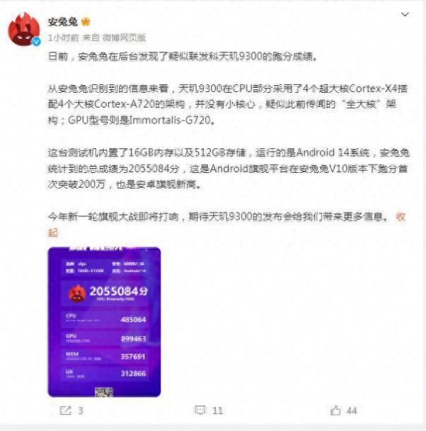 值得一提的是,在@安兔兔的这条微博中还公布了天玑9300的跑分成绩:2055084分,这也是目前安卓旗舰平台在安兔兔V10版本下跑分首次突破200万,可见在全新的全大核架构加持下的天玑9300,无疑再次捅破了安卓性能天花板。