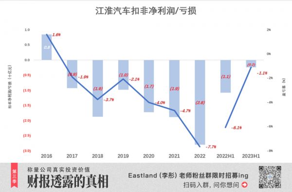 2016年,江淮汽车扣非净利润8.43亿、利润率1.6%。此后扣非净利润连续六年为负,2022年扣非净亏损27.9亿、亏损率7.7%。