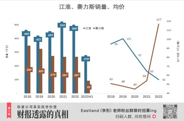值得注意的是,赛力斯销售均价的大幅反超。2020年,江淮均价超过10万元、赛力均价不到5万元;2022年,随着问界占比的提高,赛力斯出厂均价达11.7万/辆,相当于江淮的213%!