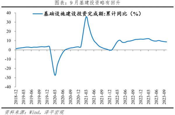 9月社会消费品零售总额同比增长5.5%;制造业投资当月同比增长7.9%;基础设施建设投资同比增长6.8%。商品房销售面积和销售额同比分别为-10.1%和-13.6%;房地产投资同比-11.3%,新开工、新增施工和竣工面积同比分别为-14.6%、-7.1%和25.3%。
